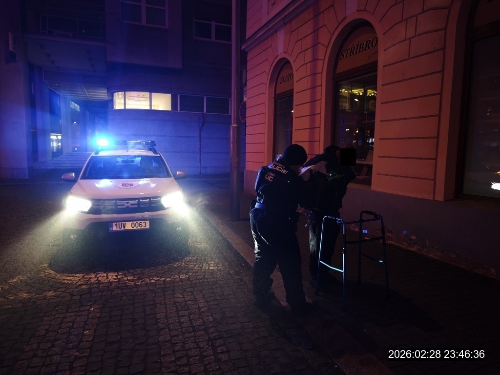Dne 28.2.2026 ve 23:45 hod., telefonoval na tísňovou linku městské policie oznamovatel, který operátorovi sdělil, že u kostela Nanebevzetí Panny Marie se nachází bezdomovec s chodítkem, který upadl a udeřil se do hlavy.