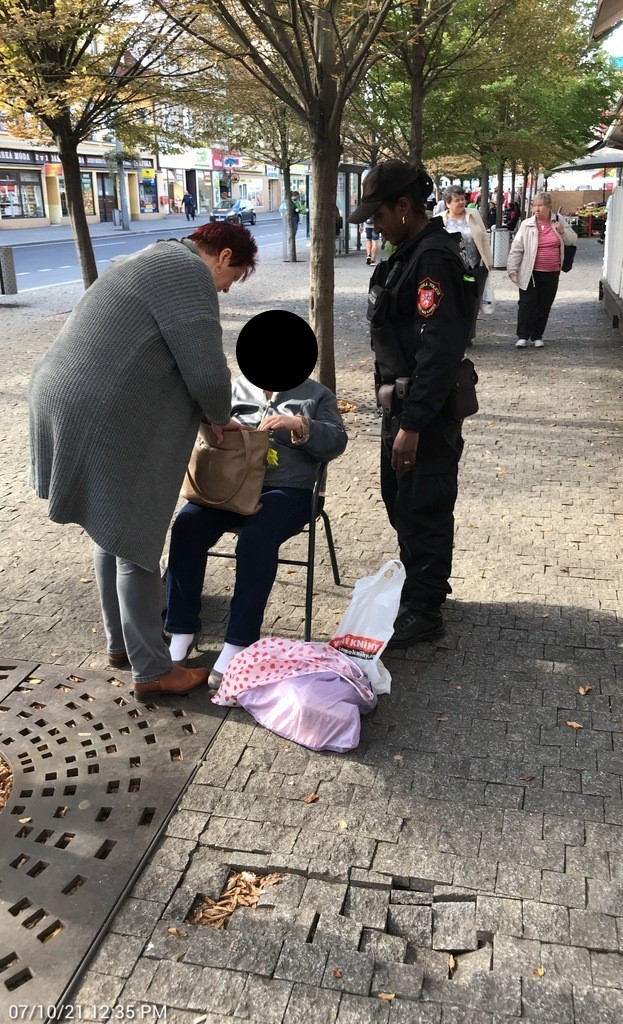 Dne 7.10.2021 v 12,30 hod., prováděla hlídka strážníků kontrolní činnost v centru města, kde si v ulici Hrnčířská všimla ženy, která upadla v důsledku špatného došlápnutí na chodník a nemohla vstát ze země. Hlídka okamžitě provedla nezbytné kroky k zjištění stavu věci a poskytla jí první pomoc, neboť žena při pádu utrpěla tržnou ránu pod levým okem. Zraněná žena si dále stěžovala na bolesti v levém koleni a z tohoto důvodu strážníci na místo přivolali zdravotní záchrannou službu, která si dotyčnou od strážníků převzala a odvezla ji do Masarykovy nemocnice k dalšímu ošetření.