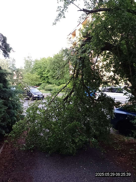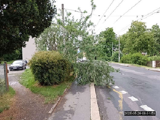 Dne 29.5.2025 v dopoledních hodinách, vyjížděli na žádost operačního střediska městské policie strážníci ze skupiny operačního zákroku ke třem případům, kdy díky silným poryvům větru a pomáčené půdě, došlo k polámání silných větví a vyvrácení dvou stromů, které bránily bezpečnému provozu, jak na vozovce, tak chůzi po chodnících. Strážníci stromy i větve pořezali a z komunikací odklidili.