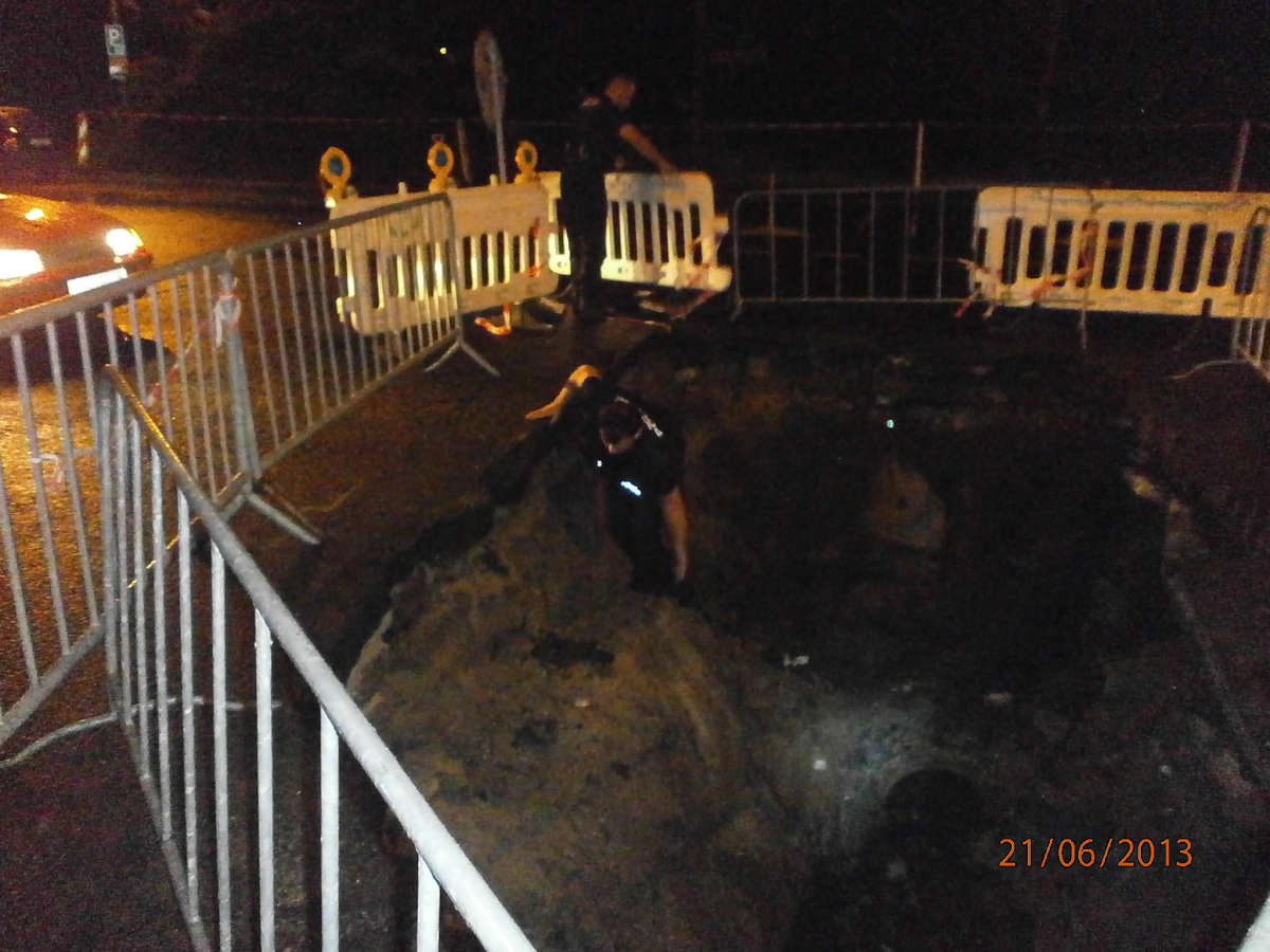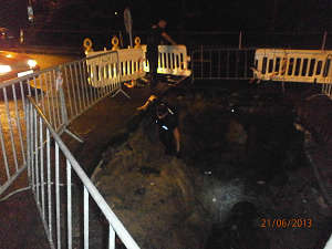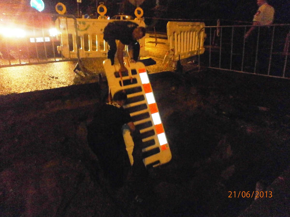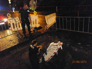 Dne 21.6.2013 v 00,45 hod., prováděla hlídka strážníků kontrolní činnost v centru města, když si v ulici Velká Hradební všimla výkopu, ve kterém byly spadlé zábrany, jenž měly chránit kolemjdoucí před případným pádem do výkopu, proto se strážníci k zábranám spustili, tyto vytáhli ven a poté vše uvedli do původního stavu.
