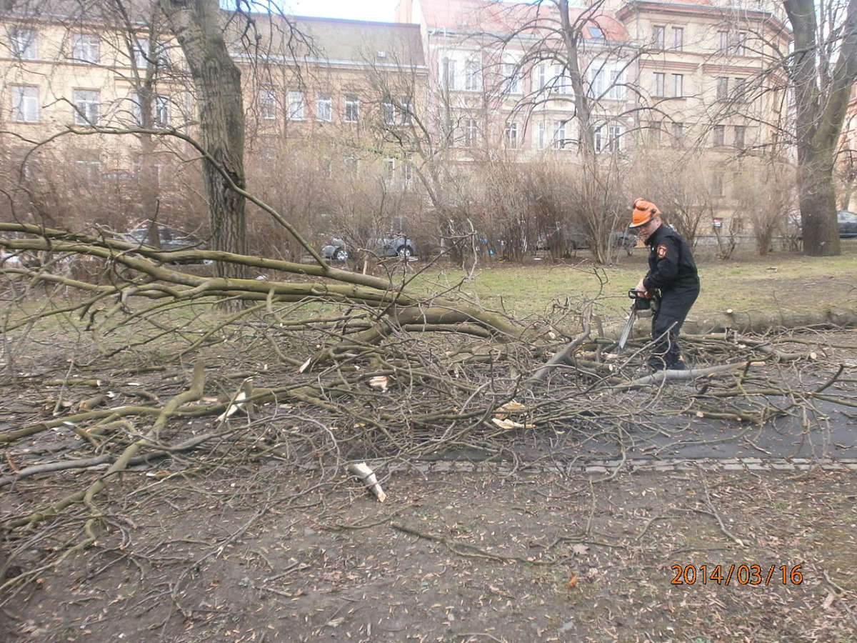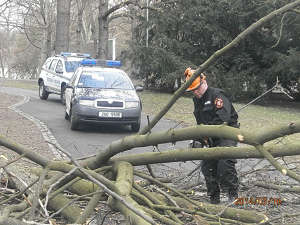 Dne 16.3. v ranních hodinách, byla na žádost operačního střediska městské policie vyslána hlídka strážníků do Městských sadů, kde došlo vlivem silného poryvu větru k pádu stromu na stezku pro chodce. Na místě strážníci spadlý strom rozřezali a stezku zprůchodnili.