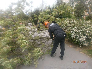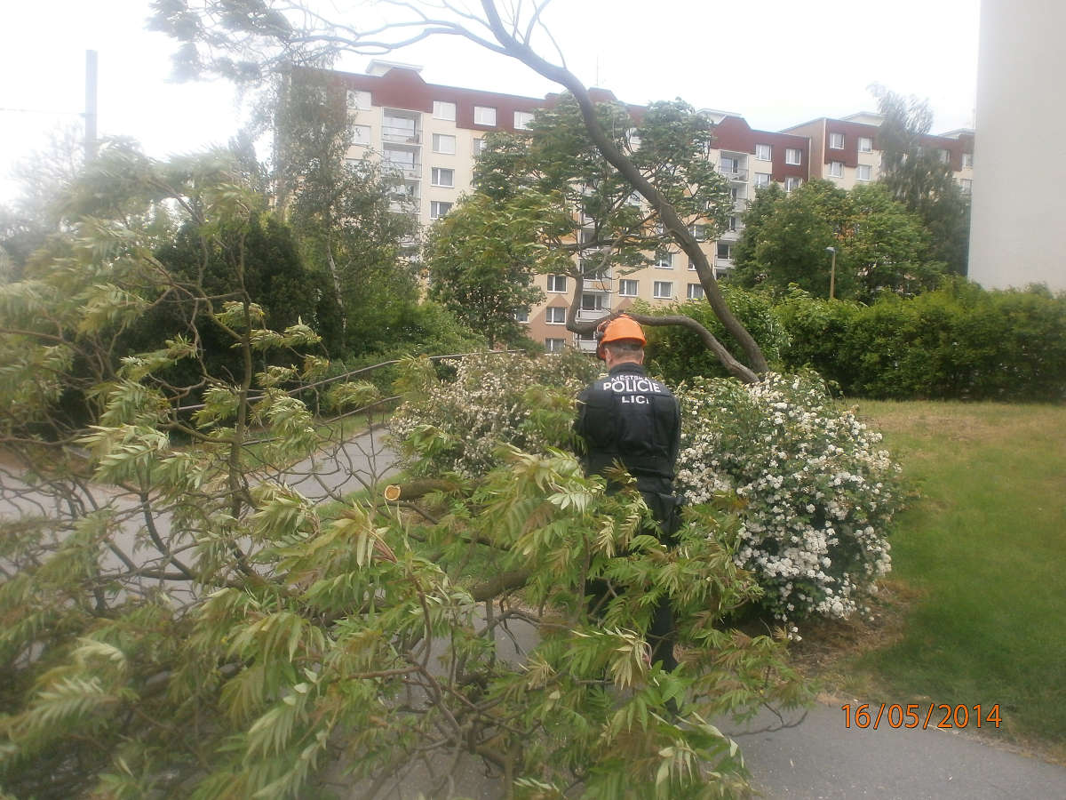 Dne 16.5.2014 v 08.00 hod., byla na žádost operačního střediska městské policie vyslána hlídka strážníků do ulice Krušnohorská, kde dle oznamovatele měl vlivem silného poryvu větru spadnout strom na místní chodník. Strážníci ze skupiny operativního zákroku spadlý strom rozřezali a chodník zprůchodnili.