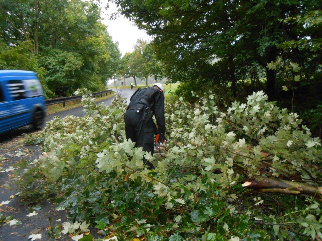 Dne 4.10.2016 v 07,35 hod., telefonoval na tísňovou linku městské policie oznamovatel, který operátorovi sdělil, že v ulici Novoveská leží na části vozovky spadlý strom a brání bezpečnému průjezdu touto pozemní komunikací. Na místo byla vyslána hlídka strážníků ze skupiny operačního zákroku, která spadlý strom rozřezala a z vozovky odklidila. Během odklízení spadlého stromu strážníci usměrňovali dopravu, aby byla zajištěna bezpečnost a plynulost silničního provozu a nedošlo k dopravní nehodě. Asi po půl hodině byl provoz na zmíněné vozovce uveden do normálního stavu.