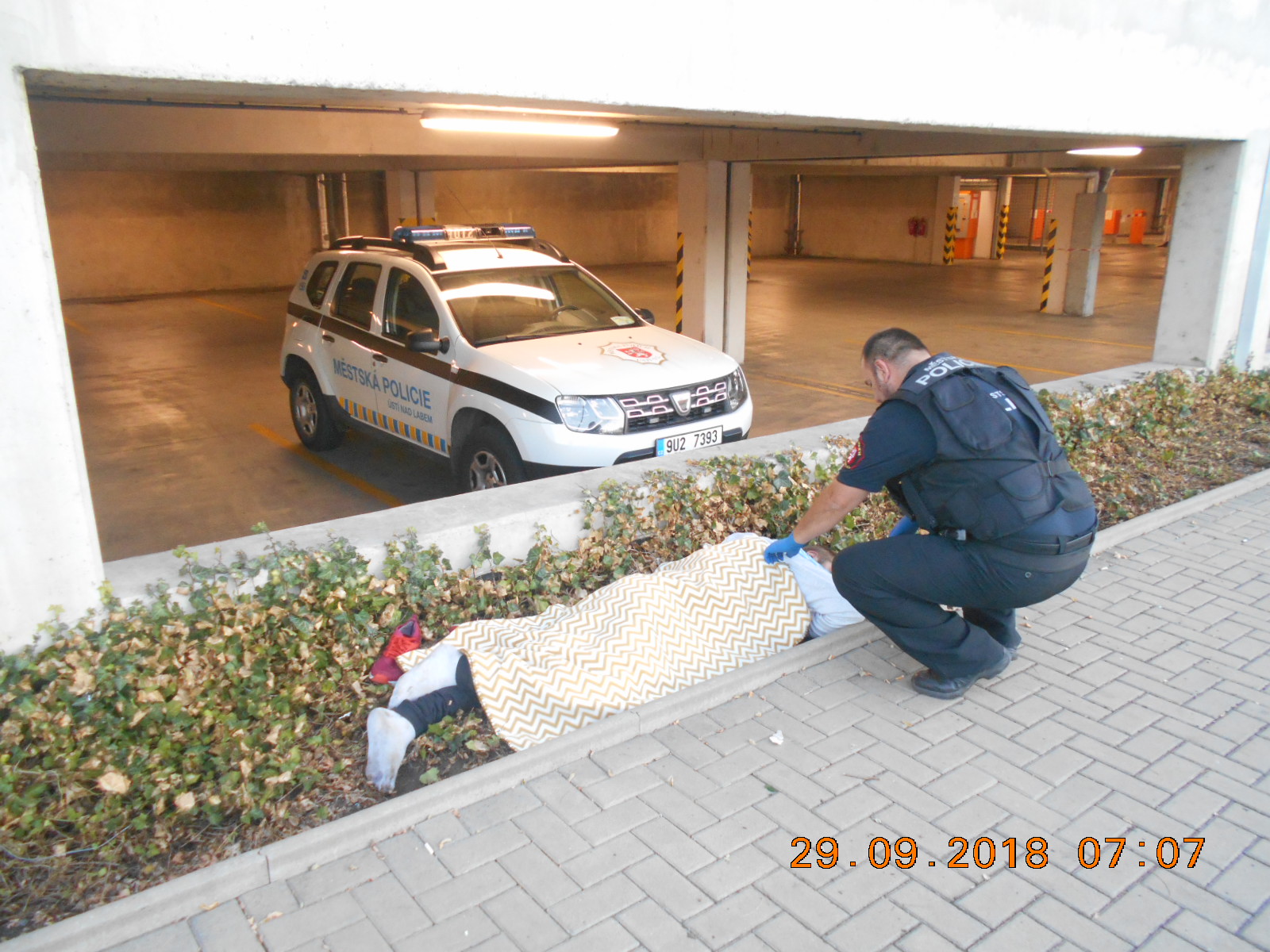 Dne 29.9.2018 v 07,05 hod., prováděla hlídka městských strážníků kontrolní činnost v prostoru garáží pod Hlavním vlakovým nádražím, kde si všimla polonahého muže, který ležel v záhonu, oddělující chodník od garáží. Strážníci muže probudili, ale vzhledem k tomu, že dotyčný byl pod vlivem neznámé návykové látky, byl podchlazený a nebyl schopen s hlídkou nijak komunikovat, zabalili strážníci muže do deky z přivolaného služebního vozidla. Z těchto důvodů byla na místo přivolána zdravotní záchranná služba, která si muže středního věku odvezla do Masarykovy nemocnice k vyšetření.