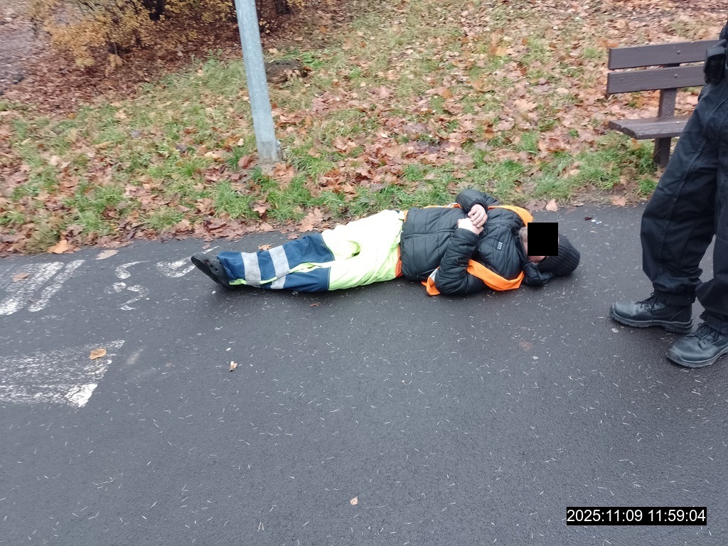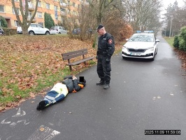 Dne 9.11.2025 ve 12:00hod., byla na žádost operačního střediska městské policie vyslána hlídka strážníků do praku Družba, odkud na tísňovou linku městské policie telefonoval oznamovatel, který operátorovi sdělil, že ve zmiňovaném parku leží na zemi osoba, která možná bude potřebovat pomoc. Na místě bylo zjištěno, že se jedná o muže středního věku ze Sokolova, který se nalézal v silně podnapilém stavu. Dotyčný byl hlídkou probuzen, poté sám vstal a posadil se na lavičku. Na dotaz hlídky, proč leží na zemi, muž odpověděl, že byl tak unaven, že si na okamžik lehl aby si odpočinul a v tu chvíli usnul. Muž neměl žádná viditelná zranění a dle jeho vyjádření mu nic nebylo. Nabídnuté lékařské ošetření odmítl. Po tomto zjištění byl dotyčný hlídkou z místa vykázán.