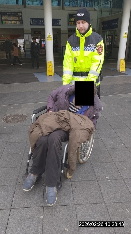 Dne 26.02.2026 v 10.15 hodin, byla vyslána hlídka strážníků před Hlavní vlakové nádraží ČD, kde se v přítomnosti dvou pracovnic Odboru sociálních věcí Magistrátu města Ústí n/L nacházel 58-letý muž na invalidním vozíku, t.č. bez domova.