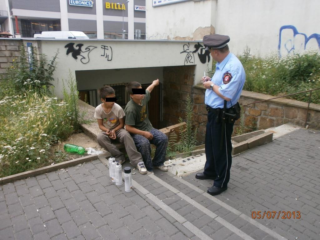 Dne 05.07.2013 ve 12.45 hodin, byla na žádost operačního střediska městské policie vyslána hlídka strážníků do ulice Klášterní, z důvodu oznámení neznámého občana, který uvedl, že přistihl dva hochy, kteří barvou ve spreji poškodili fasádu objektu bývalých veřejných záchodků v ulici Klášterní. Strážníci na místě zadrželi Markuse Š.(2000) a Jiřího Š.(2001), kteří se k činu doznali. Vzhledem k nízkému věku dotyčných, byli oba předáni rodičům, kterým bylo sděleno, že případ bude předán k dořešení oddělení sociálně právní ochrany dětí Magistrátu města Ústí nad Labem.