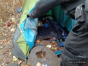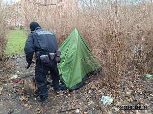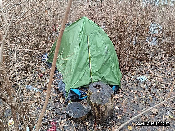 Dne 16.12.2024 v 10,00 hod., telefonoval na tísňovou linku městské policie oznamovatel, který operátorovi sdělil, že v ulici Jizerská je ve křoví postavený stan, ve kterém bydlí neznámý bezdomovec a v jeho okolí se nachází značný nepořádek. Přivolaní strážníci na místě ani v jeho okolí nezastihly žádnou osobu, proto po domluvě s úřadem obvodu Severní Terasa, bylo provizorní bydlení bezdomovce pracovníky úřadu zlikvidováno a nepořádek uklizen.
