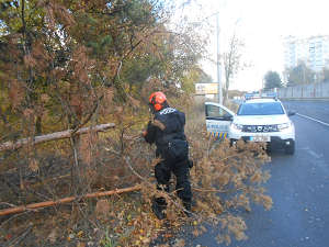 Dne 24.10.2018 v 14,20 hod., byla vyslána hlídka strážníků ze skupiny operačního zákroku o ulice Nová, odkud na tísňovou linku městské policie telefonoval oznamovatel, který operátorovi sdělil, že v uvedené ulici popadaly na vozovku stromy, které ohrožují bezpečnost a plynulost silničního provozu. Strážníci na místě zjistili, že se jedná o vývraty, které díky silným poryvům větru spadly na vozovku. Hlídka stromy rozřezala a z vozovky odklidila.