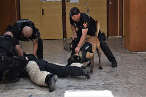 Dne 02.06.2022 provedli strážníci Služby operačního zákroku a Kynologické služby Městské policie Ústí nad Labem pravidelné cvičení, zejména techniku a taktiku řešení krizových situací. Jednalo se o ukázku techniky taktického slanění hlavou dolů, které se využívá zejména v situacích, kdy je potřeba z venkovních prostor nahlédnout přes okno do objektu s cílem získání informací důležitých pro další postup jednotek, při záchraně zraněné osoby, která zůstala viset ve výšce – převázání osoby k záchranáři a následné slanění se zraněnou osobou na zem, kde je této osobě poskytnuta další zdravotnická pomoc. Tuto činnost si se strážníky zkusil jako bývalý horolezec i primátor města Petr Nedvědický. Další ukázka spočívala v koordinované spolupráci psovoda městské policie se služebním psem s hlídkou strážníků ze skupiny operačního zákroku při zajištění agresivního pachatele trestného činu, dále vloupání do motorového vozidla – zajištění této osoby včetně zajištění další osoby, která se střelnou zbraní zaútočí na zasahující hlídku, kdy za použití služebního psa a dalších donucovacích prostředků tyto hlídky zajistí a omezí na osobní svobodě oba útočníky. Psovod městských strážníků dále předvedl práci se služebním psem, který v uzavřeném objektu zjistí a zajistí pachatele vloupání. Strážníci Služby operačního zákroku předvedli zajištění ozbrojené celostátně hledané osoby ve vozidle a její vytažení z vozidla a následné odzbrojení a zajištění, s důrazem na rychlost zásahu, moment překvapení, koordinovanost, preciznost zásahu a především bezpečnost zasahujících strážníků. Na závěr strážníci Služby operačního zákroku předvedli vedení MP metodu tzv. kontroly a čištění objektu, která spočívá v koordinované důsledné kontrole jednotlivých místností kontrolovaného objektu, ve kterém se nachází zájmová osoba (pachatel trestného činu) s důrazem na bezpečnost a taktiku postupu skupiny s cílem zjistit, zajistit a následně vyvést pachatele TČ, který byl omezen na osobní svobodě, z objektu. Provedení všech cvičných zásahů ocenil primátor Nedvědický: „Ačkoliv bych si přál, aby strážníci tyto zásahy nemuseli nikdy použít v praxi, jsem nesmírně rád, že je ovládají takto bravurně. U spousty nahlášených nebezpečných situací jsou právě naši strážníci jako první, je tedy důležité, aby byli dobře připraveni na rozličné situace a dokázali je správně vyřešit. A já jsem po zhlédnutí těchto ukázek přesvědčen, že tomu tak skutečně je,“ uvedl.