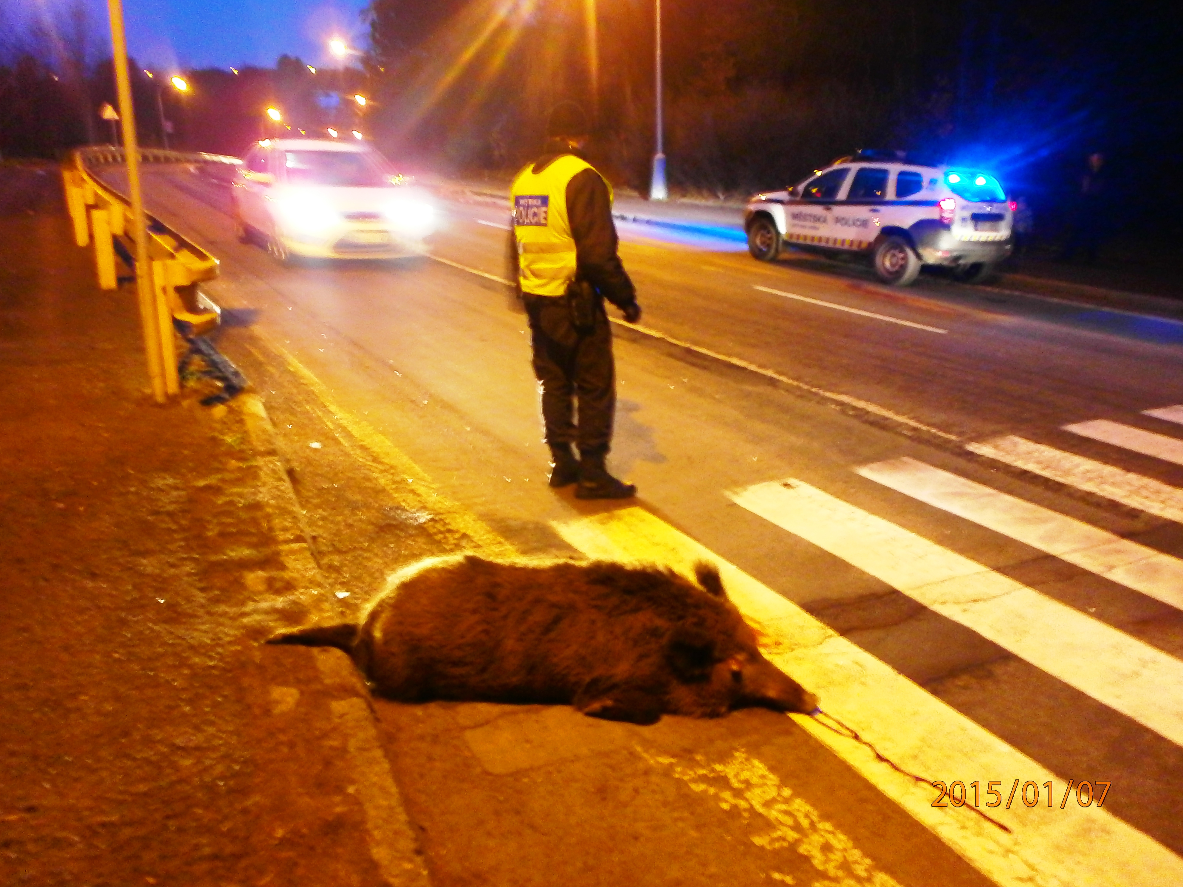 Dne 7.1.2015 v 07,20 hod., byla na žádost operačního střediska městské policie vyslána hlídka strážníků do ulice Výstupní, kde mělo dle oznamovatele dojít ke sražení a usmrcení dvou divokých prasat projíždějícím motorovým vozidlem zn. BMW. Strážníci na místo přivolali Policii ČR – dopravní nehody a až do jejich příjezdu usměrňovali dopravu. Na místo byl přivolán i myslivec z místní honitby, který si obě mrtvá zvířata odvezl.