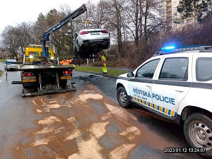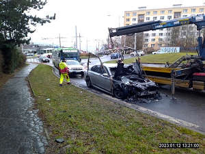 Dne 12.1.2023 v čase 12.40 hod., bylo při kontrolní činnosti strážníků v ulici Stříbrnická zjištěno vozidlo hasičů, stojící u kruhového objezdu, kde toto vozidlo blokovalo výjezd z kruhového objezdu do ulice Kočkovská. Na místě bylo od velitele zásahu zjištěno, že zde došlo k samovznícení vozidla během jízdy. Na dotaz hlídky, zda zasahující hasiči nepotřebují od strážníků nějakou pomoc, odpověděl velitel zásahu, že by potřeboval usměrňovat dopravu, a to u výjezdu z ulice Jizerská do ulice Kočkovská směrem ke kruhovému objezdu. V čase 12.45 - 13.40 hod., byla hlídkou usměrňována doprava až do doby ukončení hasebních prací a očištění vozovky. Poté byla na místo přivolána fa. AVE, jejíž pracovníci vyčistili komunikaci od zbytků shořelého plastu z vozidla.