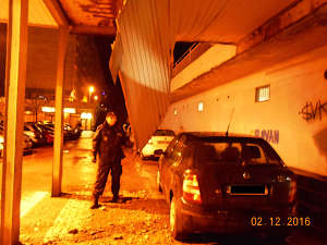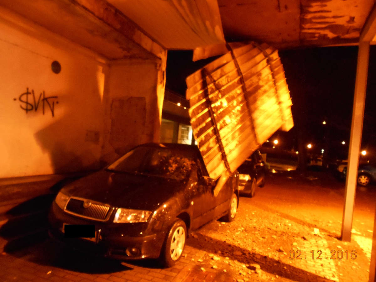 Dne 2.12.2016 v 05.10 hod., byla na žádost operačního střediska městské policie vyslána hlídka strážníků do ulice Krušnohorská z důvodu oznámení, že v blízkosti nákupního centra Norma visí z mostní konstrukce v důsledku silného větru část plechu. Na místě bylo zjištěno, že oznámení se zakládá na pravdě a že se jedná o plech o rozměrech cca. pět krát tři metry, který se nachází asi ve čtyřmetrové výšce, a který ohrožuje kolemjdoucí i zaparkovaná vozidla. Dále bylo zjištěno, že plech poškodil zaparkované vozidlo tovární značky Škoda. Z těchto důvodů byli na místo přivoláni hasiči, kteří odtržený plech z mostní konstrukce sundali.