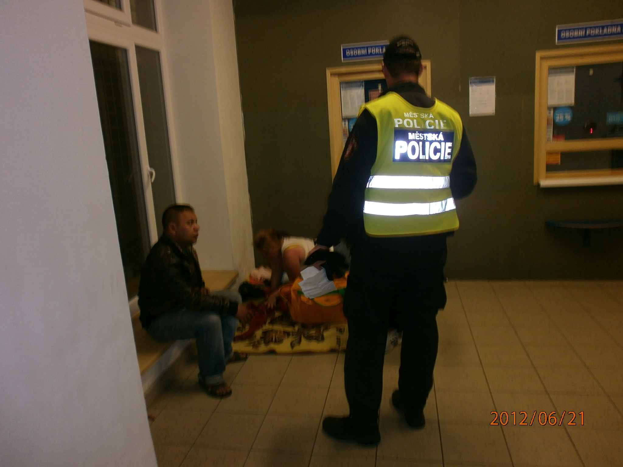 Dne 21.6. v 01,50 hod., prováděla hlídka strážníků pochůzkovou činnost v centru města v okolí vlakového nádraží, když se na ni obrátil neznámý muž, který hlídce sdělil, že v nádražní budově na podlaze u pokladen spí nějací bezdomovci. Hlídka strážníků na místě zkontrolovala dvě osoby, které měly trvalé bydliště v Rumunsku. Jednalo se o Rostase V.(1983) a Adama C.(1989), kteří strážníkům sdělili, že zde jen přenocují a dále chtějí pokračovat do SRN. Strážníci oba muže poučili o tom, že nádražní budova není noclehárna a z nádraží je vykázali.