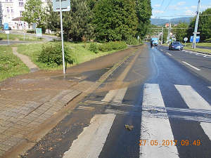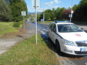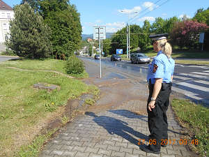 Dne 27.5.2017 v 09,40 hod., prováděla hlídka strážníků pochůzkovou činnost v obvodu Severní Terasy, kde si v ulici Sociální péče všimla vody, vytékající na vozovku, pocházející zřejmě z prasklého vodovodního řadu. Vzhledem k tomu, že voda s sebou nesla i hlínu a značně znečišťovala vozovku, kdy hrozilo nebezpečí dopravní nehody, přivolali na místo strážníci pracovníky fa. SČVaK, kteří závadu na prasklém potrubí odstranili.