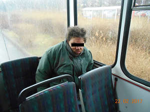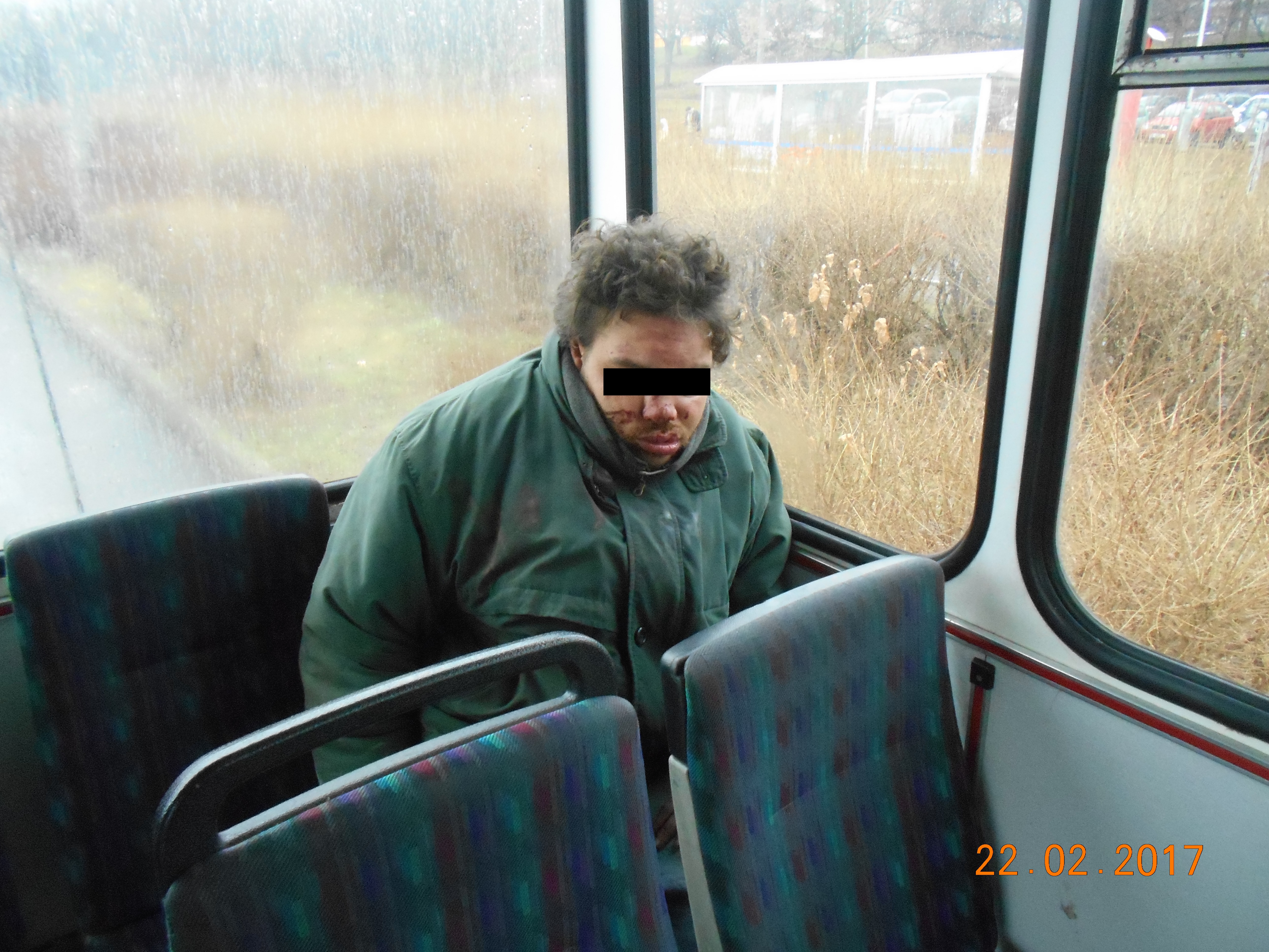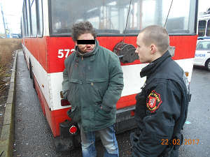 Dne 22.2.2017 v 10,05 hod., byla na žádost operačního střediska městské policie vyslána hlídka strážníků do ulice Mezní na točnu MHD, odkud na tísňovou linku městských strážníků telefonoval řidič trolejbusu, který operátorovi sdělil, že má ve voze člověka, kterého nelze probudit. Strážníci na místě zjistili, že se jedná o známého bezdomovce Viléma D.(1989), který se při příchodu hlídky částečně probral, ale nacházel se v tak podnapilém stavu, že nebyl schopen chůze ani komunikace. Strážníci dotyčného z trolejbusu vyvedli a počkali u něho až do doby, kdy byl schopen se o sebe sám postarat. Poté byl jmenovaný z místa vykázán.
