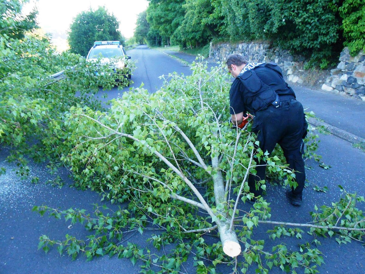Dne 11.6.2017 v 19,55 hod., byla na žádost operačního střediska městské policie vyslána hlídka strážníků do ulice Veslařská, odkud na tísňovou linku městských strážníků telefonoval oznamovatel, který operátorovi sdělil, že se ve zmiňované ulici nachází vyvrácený strom, který ohrožuje místní dopravu. Strážníci ze skupiny operačního zákroku na místě strom rozřezali a z vozovky odklidili.