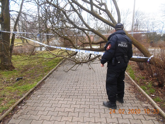 Dne 24.2.2020 v 10,30 hod., prováděla hlídka strážníků pochůzkovou činnost v obvodu Severní Terasy, kde si v ulici Mezní všimla vyvráceného stromu, spadlého na přilehlý chodník. Šetřením bylo zjištěno, že strom vyvrátil silný poryv větru, který se tudy prohnal v nočních hodinách. Strážníci místo zabezpečili páskou proti vstupu nepovolaných osob a překážku nahlásili ÚMO Severní Terasa.