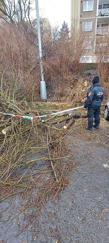 Dne 23.1.2021 v 11:35 hod., byla na žádost operačního střediska městské policie vyslána hlídka strážníků do ulice Ježkova, kde dle oznamovatele se měl sesunout svah , který vyvrátil strom, jenž spadl na čtyři zaparkovaná osobní vozidla. Strážníkům se podařilo všechny majitele vozidel kontaktovat a obeznámit je s nastalou situací. Dále strážníci na místo přivolali hlídku Policie ČR a hasiče, kteří vyvrácený strom pořezali a odklidili mimo komunikaci. Po zadokumentování celé události byl o vzniklé situaci informován i příslušný orgán ÚMO Severní Terasa, za účelem odklizení rozřezaného stromu.