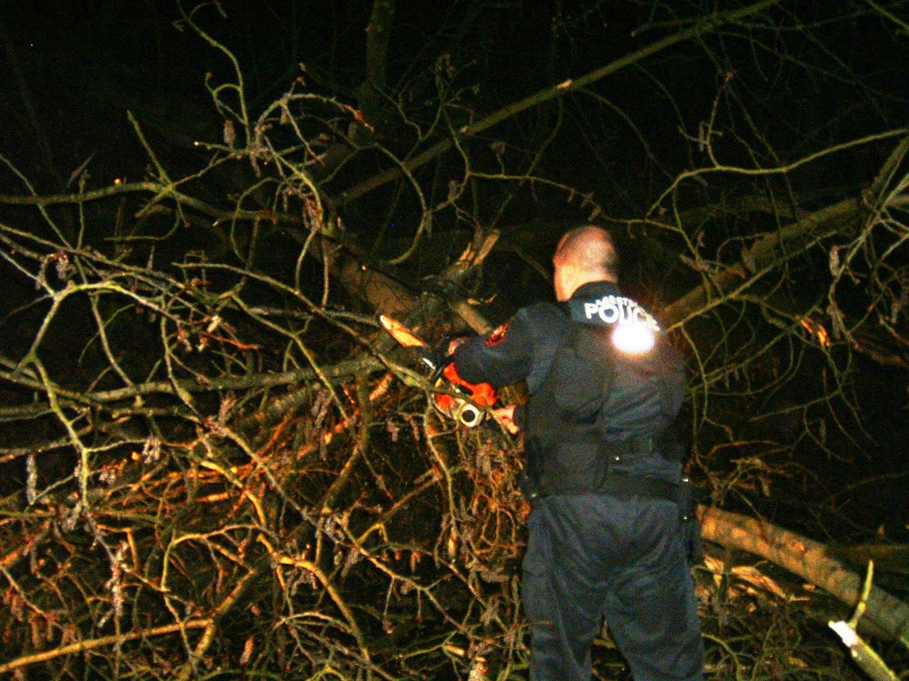 V ulici Sebuzínská strážníci rozřezali spadlý strom, který zablokoval vozovku.