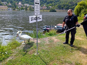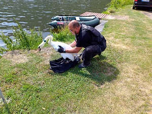 Dne 14.08.2022 v 11.30 hodin, vyjížděla hlídka strážníků ze skupiny operačního zákroku do ulice Pražská ve Vaňově, z důvodu oznámení na tísňovou linku městské policie, kam neznámý občan nahlásil, že na řece Labi se nachází poraněná labuť, která má okolo krku omotaný rybářský vlasec. Po příjezdu hlídky na místo byla labuť na řece strážníky spatřena. Ve spolupráci hlídky strážníků a hasičského záchranného sboru, byla labuť za pomoci motorového člunu odchycena do odchytového vaku a z vody vytažena na břeh. Zde bylo při bližším ohledání zjištěno, že labuť má v krku zaseknutý i rybářský háček. Z tohoto důvodu byla následně labuť převezena hlídkou strážníků na Veterinární stanici na Střekově, kde byla lékařem ošetřena. Po úspěšném ošetření byla labuť vypuštěna zpět do volné přírody.