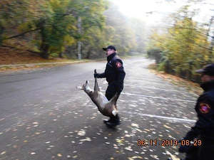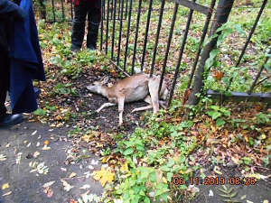 Dne 6.11.2019 v 08,20 hod., telefonoval na tísňovou linku městské policie oznamovatel, který operátorovi sdělil, že v ulici Na zacházce se nachází srna, která je zaklíněná v železném plotu a bez cizí pomoci se nedostane na svobodu. Na místo vyjela hlídka strážníků, která zjistila, že se oznámení zakládá na pravdě a pomocí páčidel se hlídce podařilo zvíře z plotu vyprostit. Vzhledem k tomu, že na zvířeti nebyly patrny žádné známky poranění, byla srna vypuštěna na bezpečném místě zpět do volné přírody.