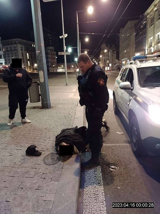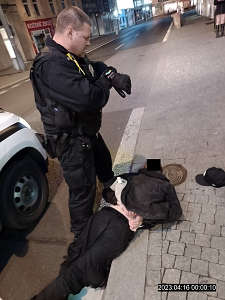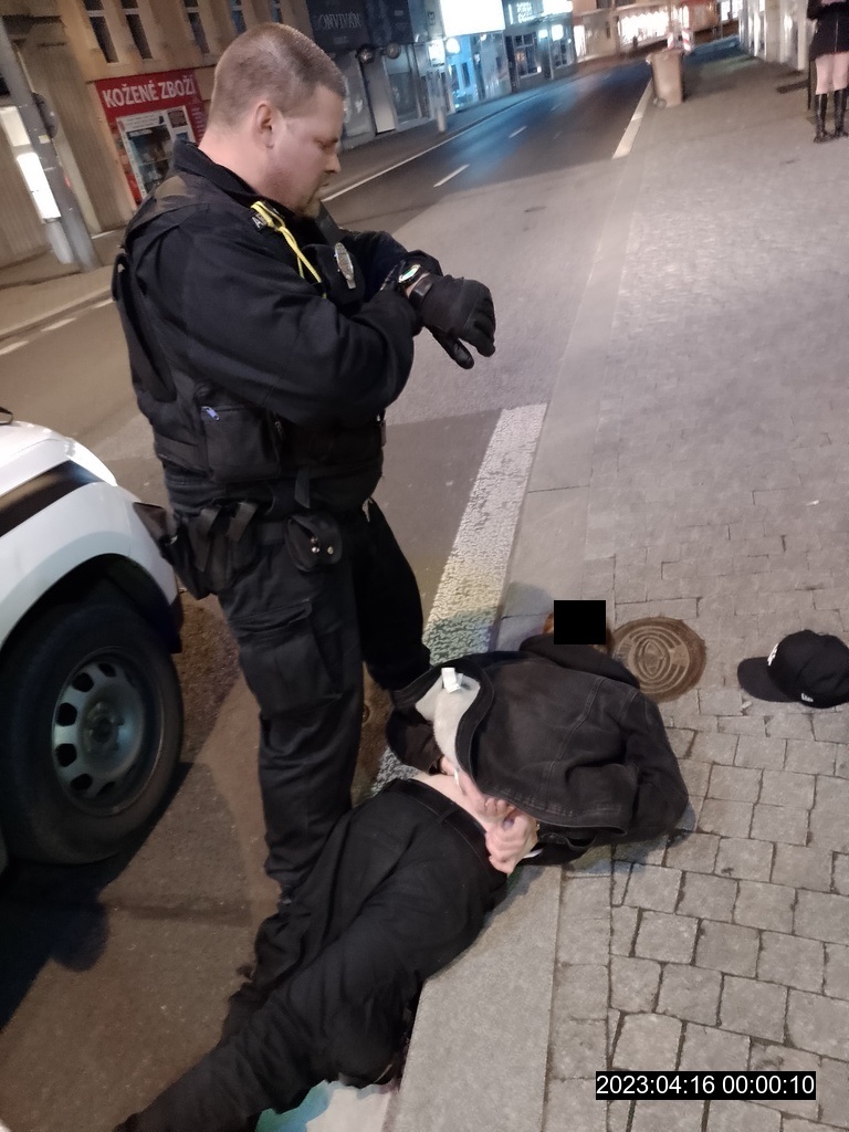 Dne 15.04. 2023 ve 23.50 hod., projížděla hlídka strážníků Mírovým náměstím, kde si na chodníku naproti provozovny McDonald všimla skupinky mladíků, kteří se mezi sebou hlasitě hádali. Hlídka u nich zastavila a snažila se zjistit stav věci. Jeden z mladíků hlídce sdělil, že mu jeden z mužů nabízel drogy, přesněji řečeno marihuanu, kterou měl v hrsti své ruky a dotyčný mu ji z ruky vyrazil. Hlídka muže vyzvala k podání vysvětlení, zda se obvinění zakládá na pravdě a zda u sebe má ještě nějaké drogy. Na toto oslovený uvedl, že „měšťákům“ určitě nic říkat a ani ukazovat nebude a ať přivolají na místo hlídku Policie ČR. Strážníci muže vyzvali, aby přistoupil ke služebnímu vozidlu a vyčkal zde do příjezdu přivolané hlídky policistů. Ten však na výzvy strážníků reagoval slovy, že tu čekat na nikoho nebude a chytil jednoho ze strážníků za rukáv oděvu a chtěl se z místa vzdálit. Z tohoto důvodu byl za pomoci hmatů a chvatů hlídkou zpacifikován a opřen o kapotu služebního vozidla, kde mu byly nasazeny služební pouta. Dále při provádění osobní prohlídky, zda osoba u sebe nemá zbraň, byl pod bundou zadrženého zajištěn igelitový pytlík (cca 25x35 cm), v němž se nacházelo neurčité množství zelené sušené rostliny. Dále měl muž při sobě peněženku černé barvy, nůžky a ledvinku, která obsahovala navigaci do automobilu. Při provádění prohlídky se muž začal hlídce vzpouzet a tak byl za pomocí hmatů a chvatů sveden na zem, kde došlo k jeho zklidnění. Mezitím se na místo dostavily prvosledové hlídky Policie ČR, které po telefonní konzultaci strážníkům uvedly, že hlídka příslušného obvodního oddělení je zaneprázdněna a požádala hlídku o převoz muže na Obvodní oddělení Policie ČR - Město. Po převozu byl zadržený předán k dalším úkonům službu konajícím policistům.