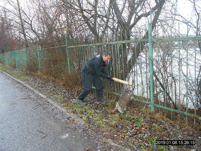 Dne 08.01.2019 po 15.hodině vyjížděla hlídka strážníků ze skupiny operačního zákroku do lokality u Habrovického rybníka, kde se dle oznamovatele měla nacházet srna, která byla zaklíněna v tamním železném oplocení. Hlídka po příjezdu na místo zaklíněnou srnu skutečně zjistila a pomocí dřevěného trámku zvíře ze sevření uvolnila. Vhledem k tomu, že zákrok hlídky byl proveden poměrně rychle po oznámení, nebyla srna nijak viditelně poraněná a proto po vyproštění byla strážníky vypuštěna do volné přírody.
