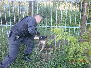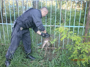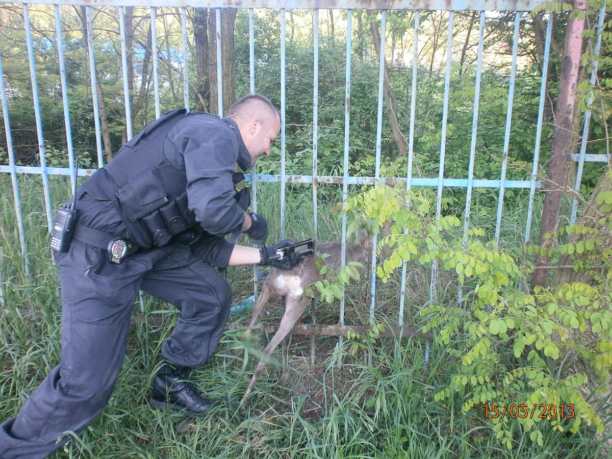 Dne 15.5.2013 v 10,20 hod., telefonoval na tísňovou linku městské policie neznámý muž, který uvedl, že v ulici Vinařská je v železném plotě fotbalového stadionu zaklíněná srnka, která se nemůže dostat ven. Na místo byla vyslána hlídka strážníků, která pomocí heveru roztáhla železné tyče a tím zvíře uvolnila. Srna neutrpěla žádná viditelná zranění, proto ji strážníci pustili do volné přírody.