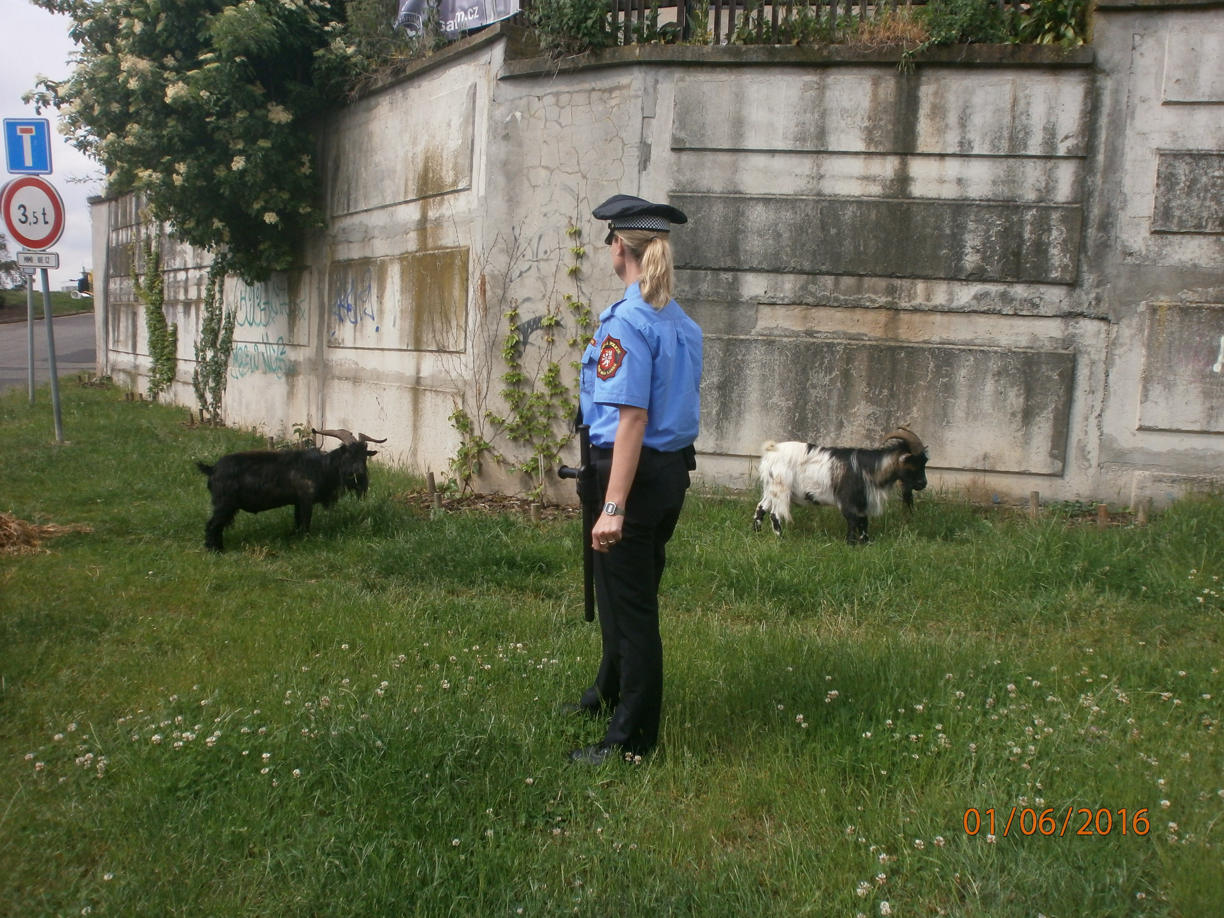 Dne 1.6.2016 v 10.15hod., byla na žádost operačního střediska městské policie vyslána hlídka strážníků do ulice Brandtova, kde se dle oznamovatele měly pást u vjezdu do této ulice kozy a ohrožovat bezpečnost a plynulost silničního provozu. Strážníci na místě zjistili, že se jedná o dvě zvířata, která utekla svému majiteli ze zahrady. Šetřením bylo zjištěno, že majitelem zvířat je Bohumil K.(1966), který byl strážníky kontaktován, a který si posléze kozy odvedl zpět do výběhu.