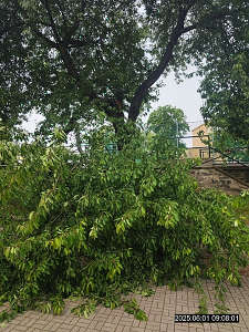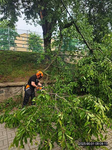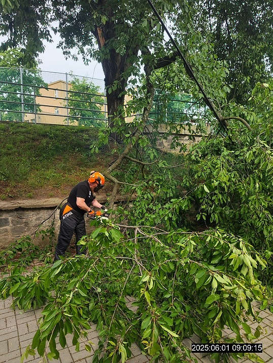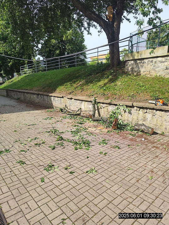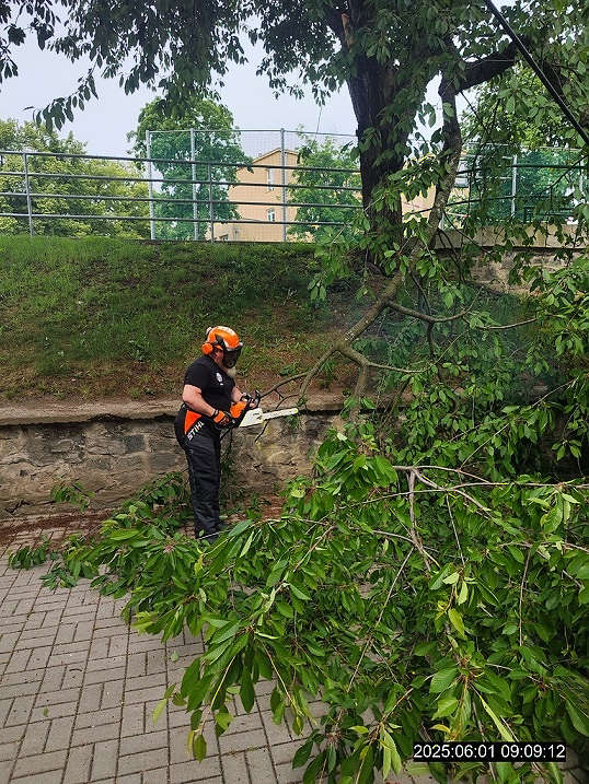 Dne 1.6.2025 v 09,00 hod., byla na žádost operačního střediska městské policie vyslána hlídka strážníků ze skupiny operačního zákroku do areálu Fakultní ZŠ v ulici České mládeže, kde dle oznamovatele se na pozemku školy, díky silnému poryvu větru, zlomila větev stromu, která spadla na přívodní kabel od kamerového systému a tím pádem došlo i k vylomení sloupu ze základu. Hlídka za pomocí motorové pily větev pořezala a z místa odklidila. Závada na vyvráceném sloupu byla předána servisní organizaci, která zjedná nápravu.