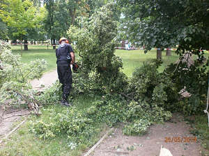 Dne 26.5.2014 v 13,45 hod., telefonoval na tísňovou linku městské policie neznámý muž, který operátorovi sdělil, že v parku U Pivovarské Zahrady spadla silná větev a brání volnému pohybu po parku. Na místo byla vyslána hlídka strážníků ze skupiny operativního zákroku, která zde zjistila další větev, jenž vlivem silného poryvu větru byla nalomená a hrozil další pád větve na chodník. Strážníci pomocí lezecké techniky nalomenou větev odřízli a po rozřezání celý prostor vyčistili.
