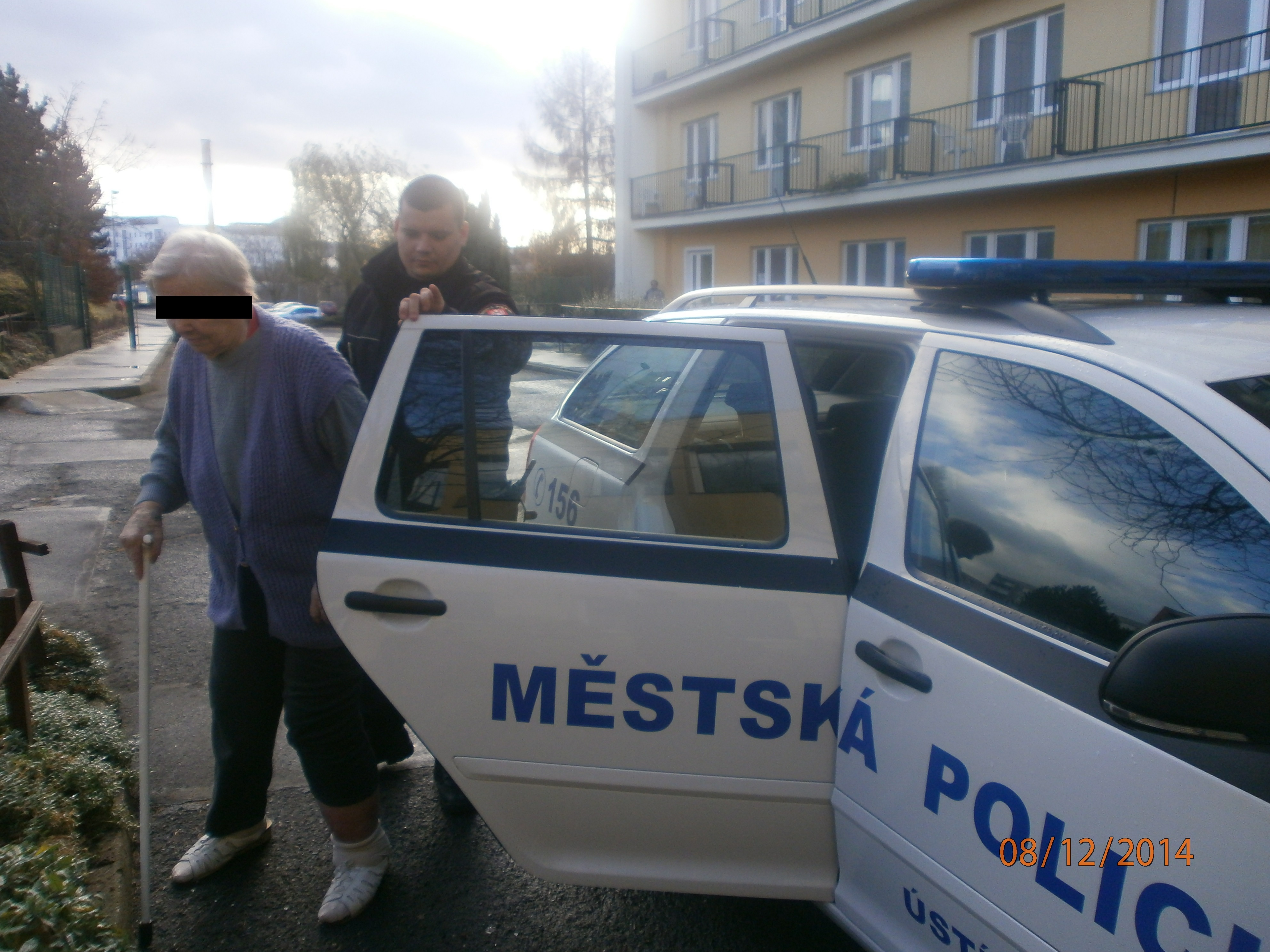 Dne 8.12.2014 v 11.15 hod., byla na žádost operačního střediska městské policie vyslána hlídka strážníků do ulice Větrná, z důvodu oznámení, že se zde pohybuje starší žena, která je zmatená a neví kde se nachází. Po příjezdu hlídky na místo bylo šetřením zjištěno, že se jedná o Zdeňku J,(1924), která odešla z domova důchodců na Severní terase a netrefila zpět. Strážníci jmenovanou naložili do služebního vozidla a odvezli zpět do domova důchodců, kde dotyčnou předali tamnímu personálu.