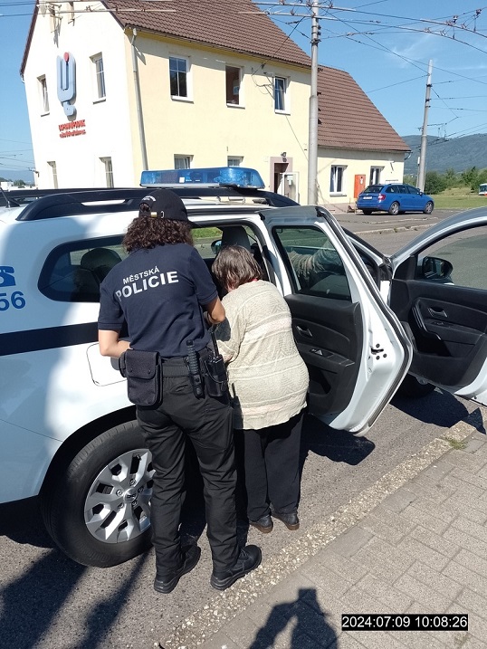 Dne 9.7.2024 v 09.50 hodin, byla na žádost operačního střediska městské policie vyslána hlídka strážníků do ulice Masarykova na konečnou linky trolejbusu, odkud na tísňovou linku městské policie telefonoval oznamovatel, který operátorovi sdělil, že se zde nachází neznámá žena, která je dezorientovaná a celkově se chová pomateně. Na místě byla zjištěna žena vyššího věku, bytem Ústí nad Labem, která s hlídkou komunikovala, ale vzhledem ke své indispozici jen velmi omezeně. Následně byla služebním vozidlem strážníků převezena do místa jejího současného bydliště, a to na ubytovnu, kde byla předána tamnímu obsluhujícímu personálu.
