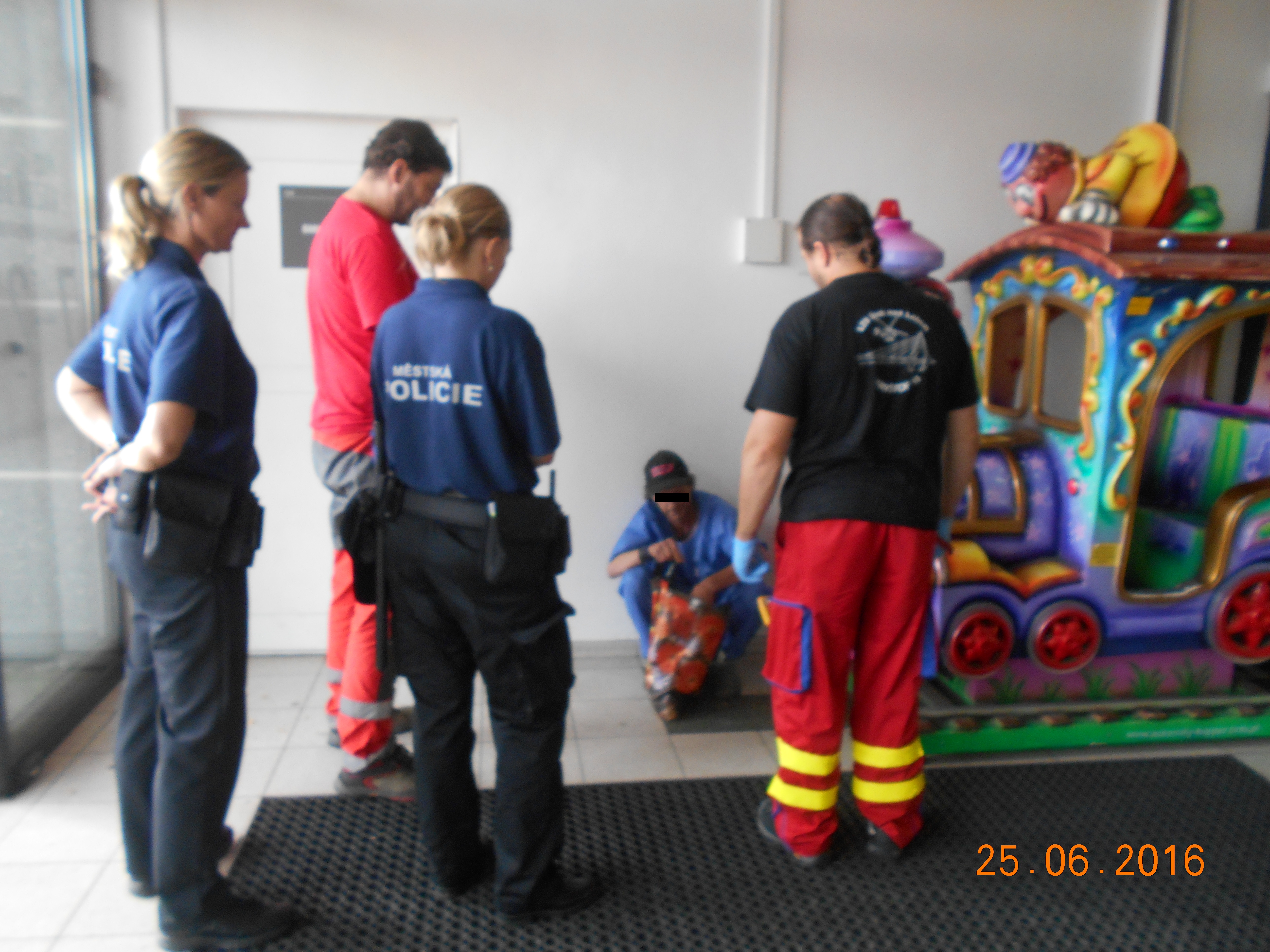 Dne 25.6.2016 v 16,40 hod., byla na žádost operačního střediska městské policie vyslána hlídka strážníků do nákupního střediska Albert v ulici Krušnohorská, odkud na tísňovou linku městské policie telefonoval pracovník střediska, který operátorovi sdělil, že po nákupním centru se pohybuje neznámý člověk, který je bez bot a oděn pouze v nemocničním oblečení. Strážníci na místě zadrželi Roberta K.(1966), který na otázku strážníků, co zde takto oděný pohledává odpověděl, že přesně neví, ale že si jen zřejmě odskočil z nemocnice, kde je v současné době hospitalizován. Vzhledem k tomu, že jmenovaný vrávoral a jen stěží se strážníky komunikoval, byla na místo přivolána zdravotní záchranná služba, která si dotyčného odvezla zpět do Masarykovy nemocnice.