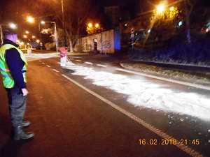 Dne 16.2.2018 v 21,15 hod., prováděla hlídka strážníků pochůzkovou činnost v obvodu Severní Terasy, kde si v ulici Sibiřská všimla na vozovce rozlitou barvu. Tuto nastalou situaci strážníci nahlásili hasičům, kteří po příjezdu na místo barvu z vozovky odstranili a znečištěnou komunikaci uvedli do původního stavu. Po celou dobu čištění vozovky strážníci usměrňovali dopravu.