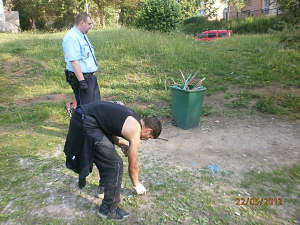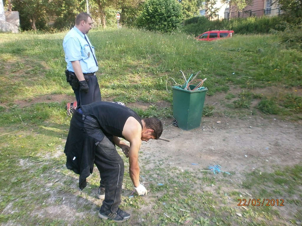 Dne 22.5.2012 v 7.45 hod. byla na žádost operačního střediska městské policie vyslána hlídka strážníků do ulice České Mládeže, kde na místním dětském hřišti měl neznámý muž rozřezávat kabely a po sobě zanechávat značný nepořádek. Hlídka strážníků na místě zadržela Jana B.(1988), který nejenže znečisťoval veřejné prostranství, ale neuměl hlídce vysvětlit, jak ke kabelům přišel, ani kde vzal pojízdnou plastovou popelnici, do které ukládal oholené dráty. Jmenovaný byl hlídkou donucen nepořádek po sobě uklidit a celý kontraband mu byl odebrán. Ten po zadokumentování celého případu byl předán příslušné přestupkové komisi, kde bude sloužit jako důkazný materiál při projednání přestupku.