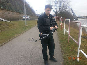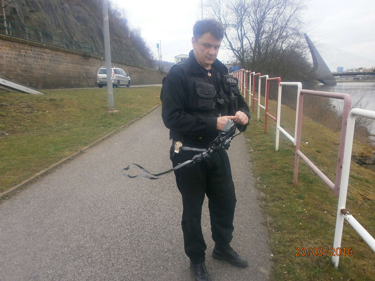 Dne 20.3.2016 v 09,50 hod., byla na žádost operačního střediska městské policie vyslána hlídka strážníků na cyklostezku do úseku mezi Mariánským mostem a Olšinkami, odkud na tísňovou linku městské policie telefonoval oznamovatel, který operátorovi sdělil, že na cyklostezce leží zraněný cyklista. Hlídka na místě zjistila, že se jedná o Josefa G.(1970), bytem Ústí nad Labem, který strážníkům uvedl, že přes cyklostezku byla natažena černá páska (videopáska), do které dotyčný cyklista najel a díky tomu upadl z kola, čímž si přivodil mnohačetná zranění. Mezi viditelná zranění patřila pravděpodobná zlomenina pravého loktu, zlomenina pravého zápěstí a naražené koleno. Strážníci zraněnému zafixovali poraněnou ruku a nabídla postiženému přivolání zdravotní záchranné služby, což dotyčný odmítl s tím, že se na trase nachází jeho manželka, která ho dopraví do nemocnice sama jejich osobním vozidlem. Strážníci na místě se zraněným vytrvali do příjezdu z,íněné manželky, které pomohli s naložením dotyčného do jejich vozidla. Následně byl celý případ předán k dořešení Policii ČR, která bude šetřit celou záležitost jako trestný čin.