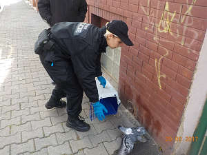 Dne 20.9.2017 v 14,55 hod., byl na žádost operačního střediska městské policie proveden výjezd strážníků do ulice U Radnice, odkud telefonoval oznamovatel, který operátorovi sdělil, že se ve zmíněné ulici nachází holub, který je zřejmě poraněn. Strážníci na místě zjistili, že holub má poraněnou nohu a bez pomoci zřejmě uhyne. Z tohoto důvodu hlídka ptáka odchytla a odvezla do ZOO k ošetření.