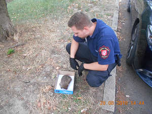 Dne 28.8.2018 v 14.33 hod., byli operačním střediskem městské policie vysláni strážníci do ulice Zvonková, odkud na tísňovou linku městské policie telefonoval oznamovatel, který operátorovi sdělil, že našel zraněného ježka a neví co s ním. Po příjezdu hlídky na místo si strážníci od oznamovatele ježka převzali a odvezli ho k veterináři, který se o zvíře postaral.