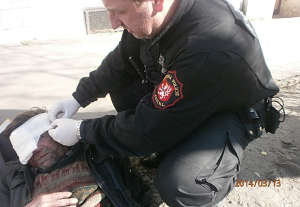 Dne 13.3.2014 v 10,15 hod., byla na žádost operačního střediska městské policie vyslána hlídka strážníků do ulice Prostřední, kde dle neznámého oznamovatele měl na ulici ležet zřejmě zraněný člověk. Strážníci na místě zjistili muže, který měl tržnou ránu na hlavě a silně krvácel. Hlídka muži poskytla první pomoc a na místo přivolala rychlou záchrannou službu, která si dotyčného převezla do Masarykovy nemocnice k dalšímu ošetření. Šetřením bylo zjištěno, že se jedná o Miroslava P.(1953), bytem Děčín, který strážníkům sdělil, že vypil asi tři litry vína, zatočila se mu hlava a on bez cizího zavinění upadl na zem, přičemž si rozbil hlavu.